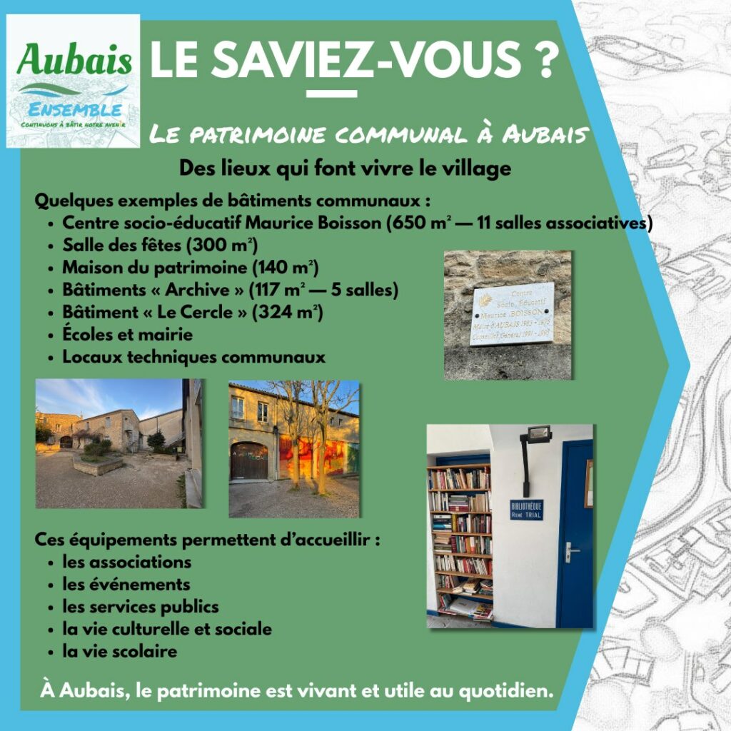 Aubais, ce ne sont pas seulement des paysages et une histoire. C’est aussi un patrimoine communal important, entretenu et utilisé chaque jour.